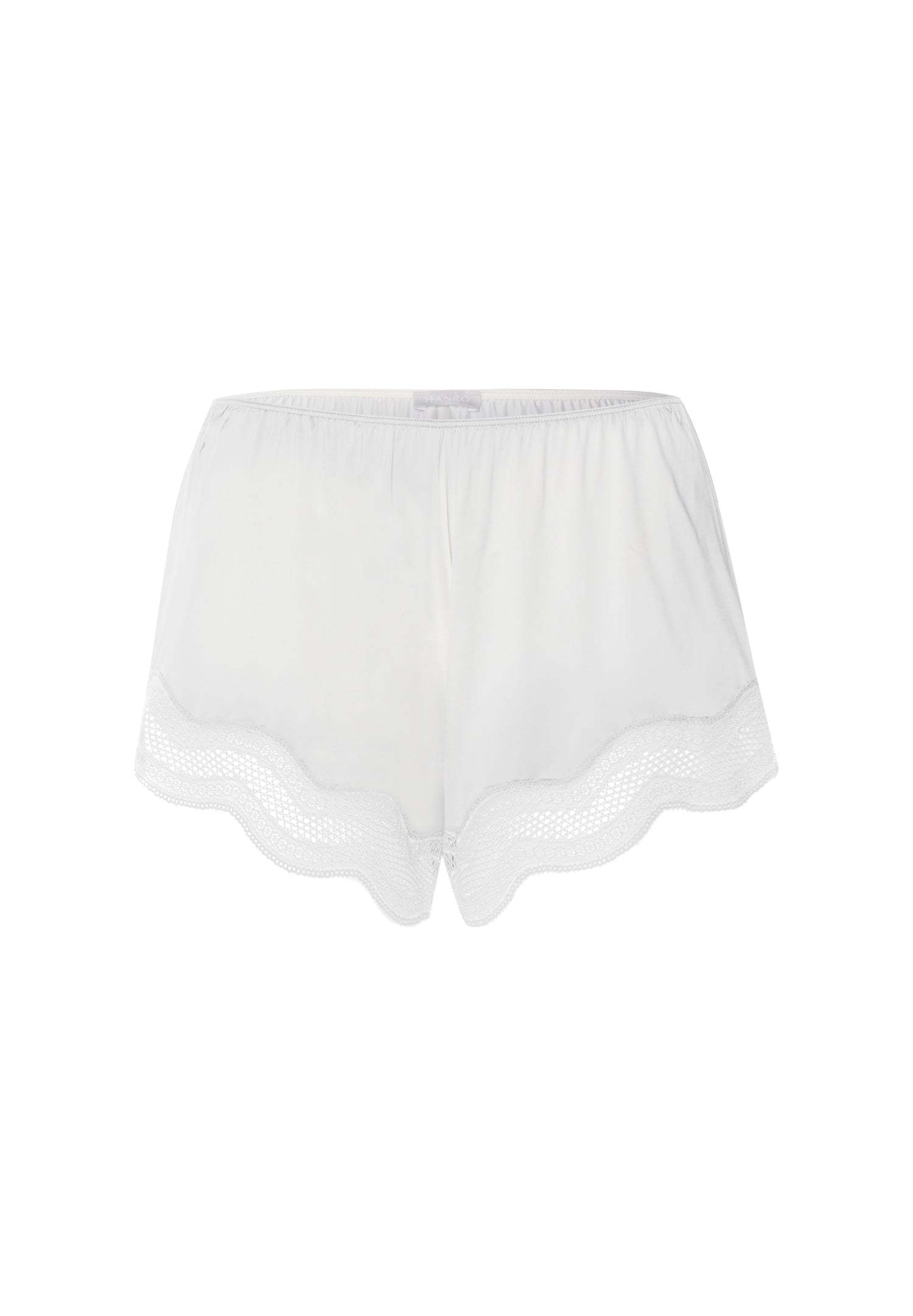 The airy, perforated lace on these summery knickers with a thin elastic waistband gently caresses the legs. The soft, graphic tulle lace hem is slightly rounded at the sides. The antistatic fabric is manufactured in our in-house production facility and feels velvety soft on the skin. The natural sheen of the flowing fabric makes these shorts an elegant companion when traveling, at the spa, or during leisure time. When paired with the matching camisole, these shorts become a modern pajama set that is ideal for warm nights thanks to the cooling effect of the viscose.