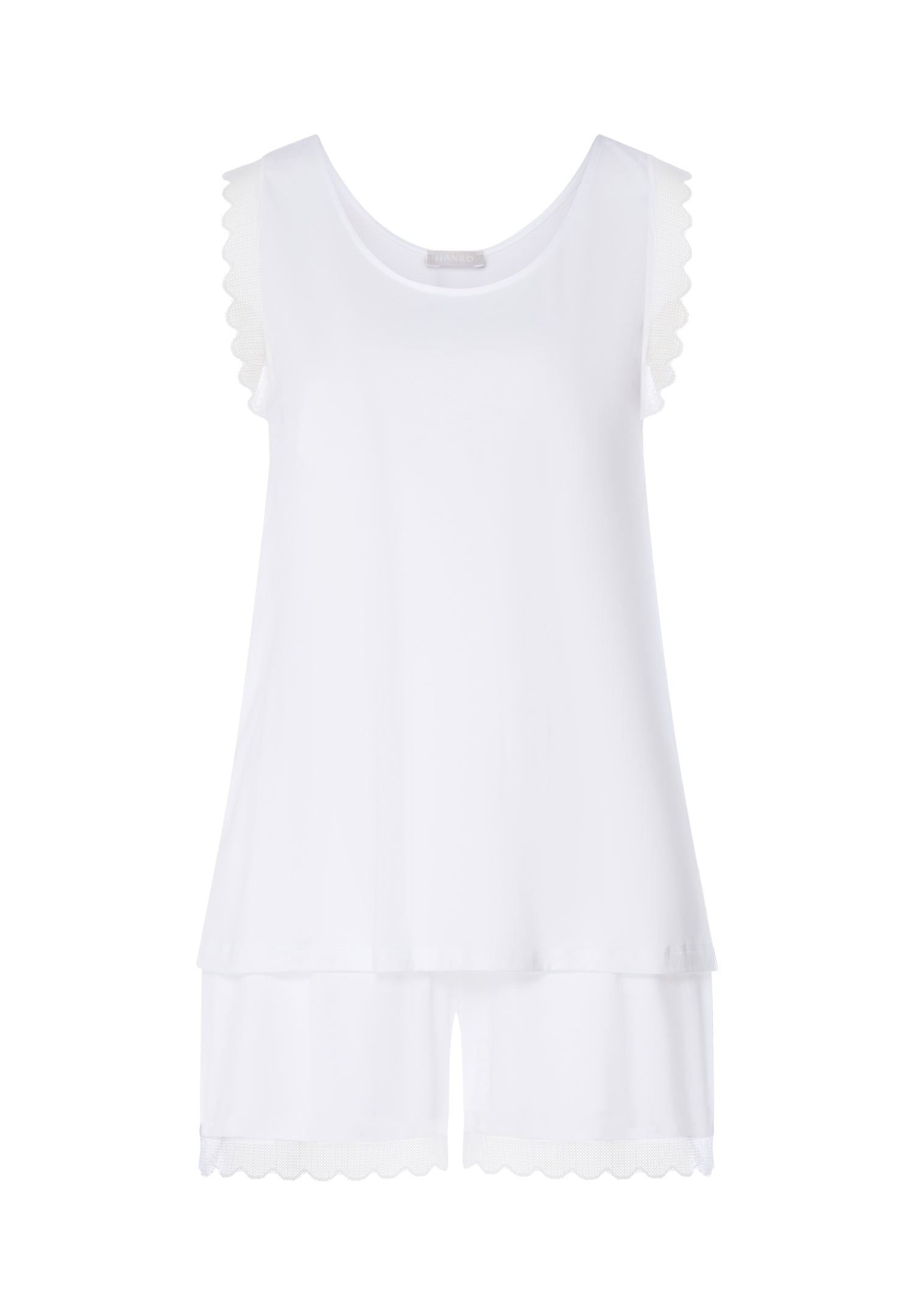 Slightly shimmering, scalloped tulle lace adorns the armholes of this pajama top like little fairy wings. The Italian-made tulle trim on the hem of the shorts also exudes charm. The comfortable neckline and elastic waistband of this sleeveless pajama set ensure night-time comfort. These shorts feature a flowing, subtly shiny fabric made in-house by HANRO. 100% extra-soft, mercerized US Pima cotton ensures long-lasting sleeping pleasure with high shape retention and good moisture management.