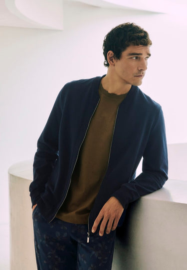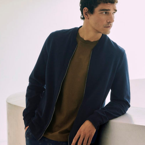 Stay on trend with this comfortable, sustainable, club-style sweat jacket. The functional design with stand-up collar and zipper is modern and fresh. The two front pockets and timeless ribbing at the neck and waistband trims adds sporty accents. Made of high-quality organic cotton-elastane for the perfect fit. Slightly roughened on the inside, this jacket gives you a cozy feeling on the skin all year round and in cooler temperatures for lounging, in the home office and on the go.