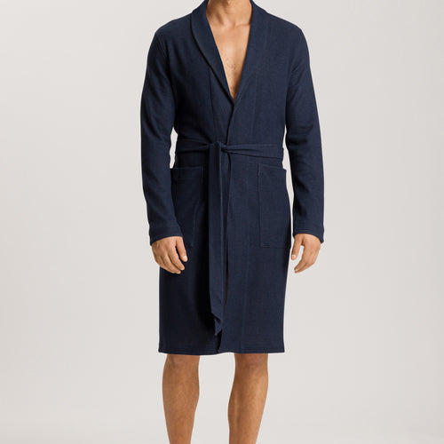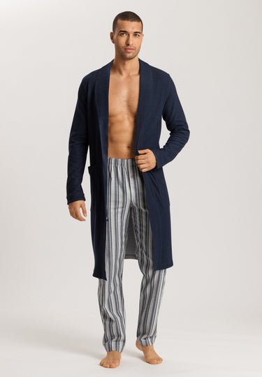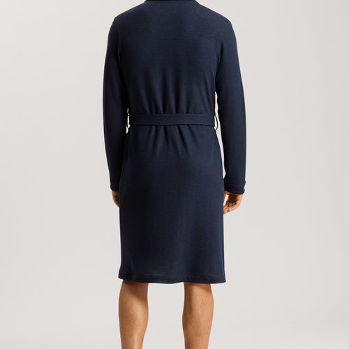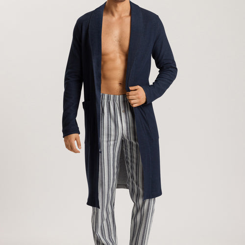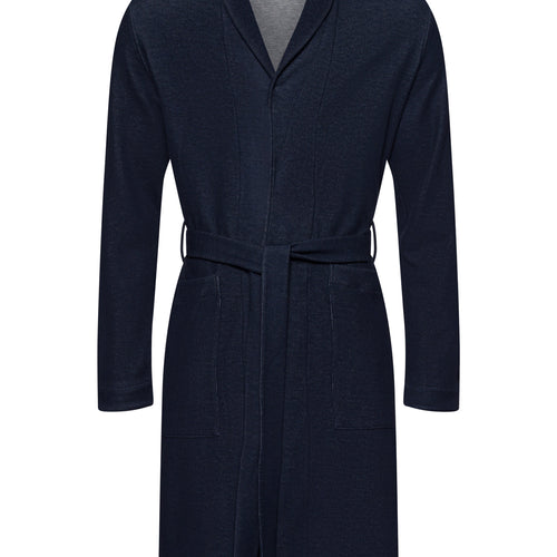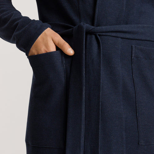 This HANRO robe from the Cozy Living collection is must-have loungewear piece. It is made of soft double-face jersey with cotton from recycled fibers. This provides an ultra-comfortable feel and brings a touch of luxury to your skin. The reversible style is great for relaxing at home and pairs perfectly with styles from the Woolen Silk and Cozy Comfort collections.