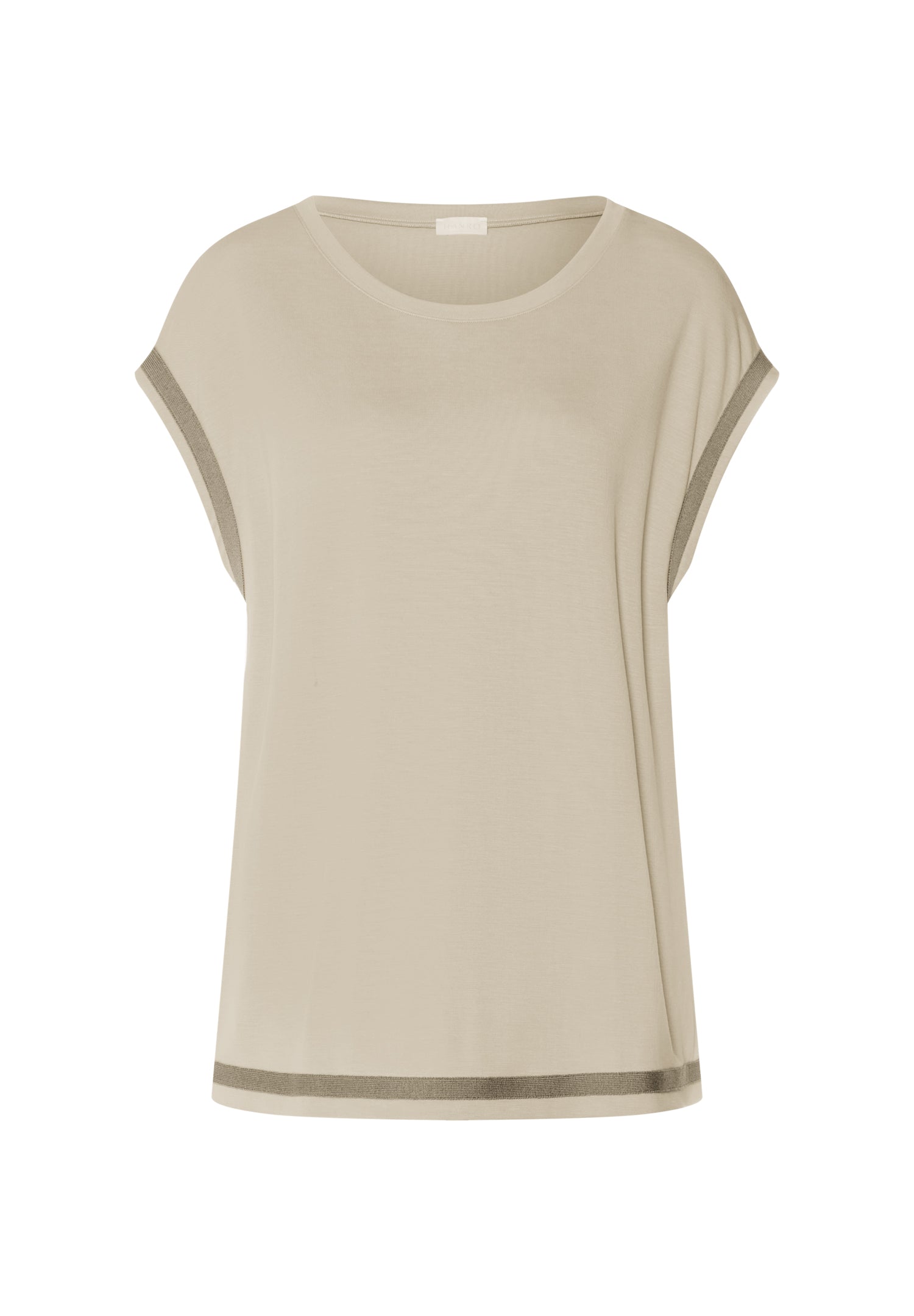 This feminine tank top with slightly oversized shoulders is ideal for traveling or working from home. The short sleeves and hem are adorned with sewn-on decorative trim in a light, contrasting color. The soft, breathable material made from a sustainable TENCEL™ Lyocell blend is particularly popular in summer, as the fibers naturally minimize odors. Thanks to its good moisture management, the skin-friendly interlock ensures a dry feel in warm weather. For a solid-colored look, shorts and pants are available in the same design.