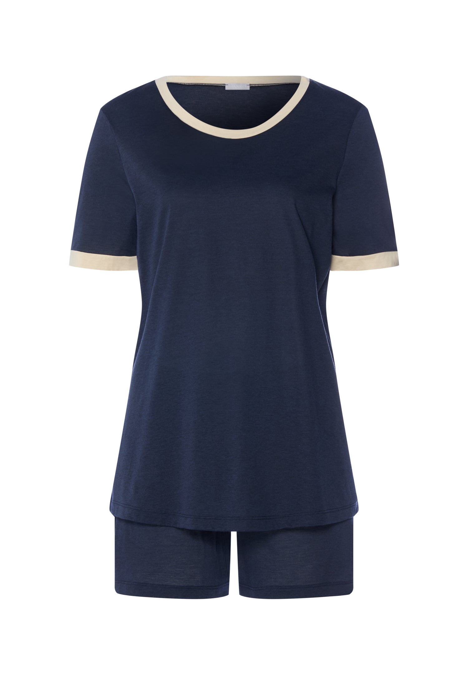 Laura, a sure stunner to celebrate HANROs 140th anniversary collection. This vignette is tailored from a smooth cotton-modal blend for softness against your skin. This easy to wear set boasts a casual relaxed fit. With its modern color blocking, this shorty pajama is perfect for sleeping, lounging, and everyday wear. It is also a must have vacation piece!