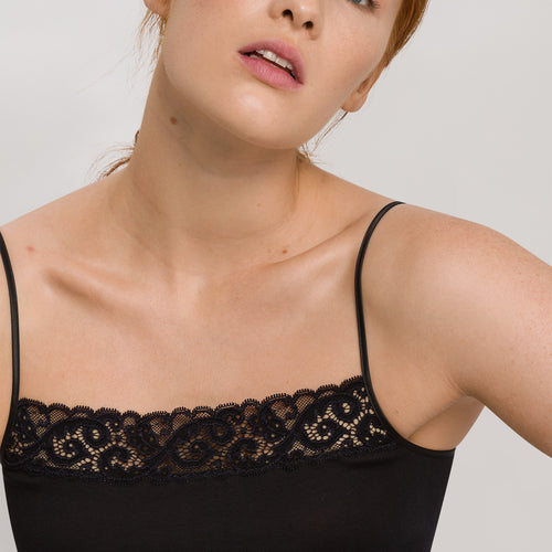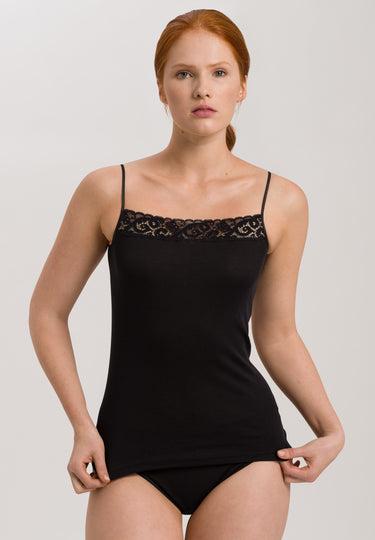 Feminine and versatile, the HANRO Moments Camisole Top features a sleek, flattering design trimmed with French lace along the neckline and spaghetti straps adjust in the back with nickel-free, metal hardware, for a touch of everyday elegance. Tailored from 100% Mercerized long-staple cotton®, this camisole top also boasts no side seams; for comfort and a smooth profile beneath clothes.