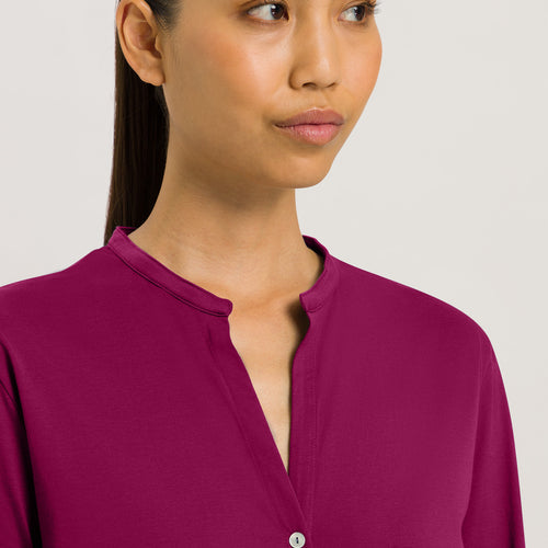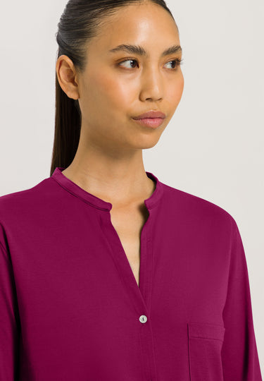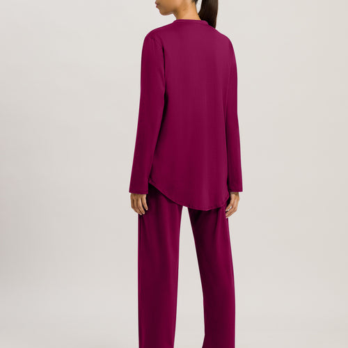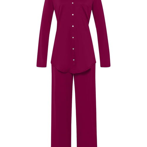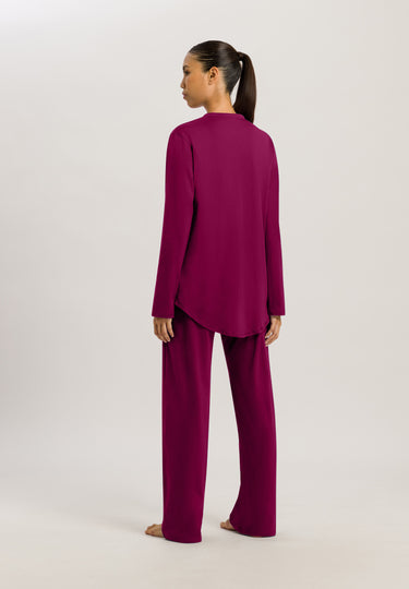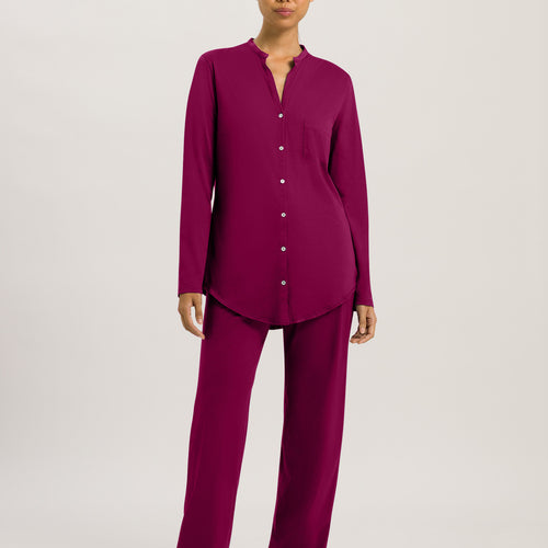 Clean and contemporary, the HANRO Cotton Deluxe Long Sleeve Button Front Pajama set combines classic pajama styling with functional, fashionable design elements. The long sleeve pajama top has a button front with mother-of-pearl buttons and a practical chest pocket, while the full-length pajama pants feature a covered elastic waistband for a custom fit.