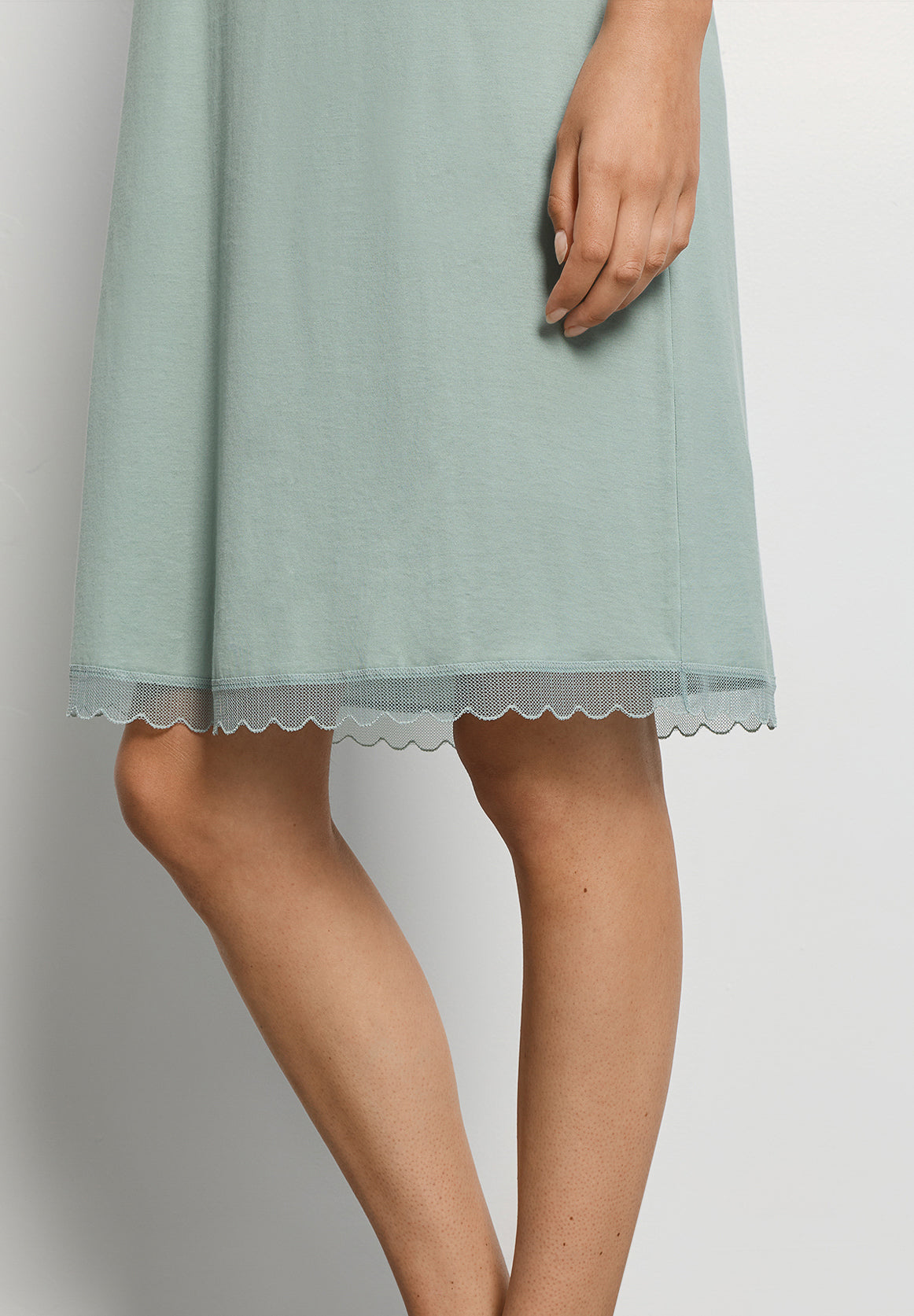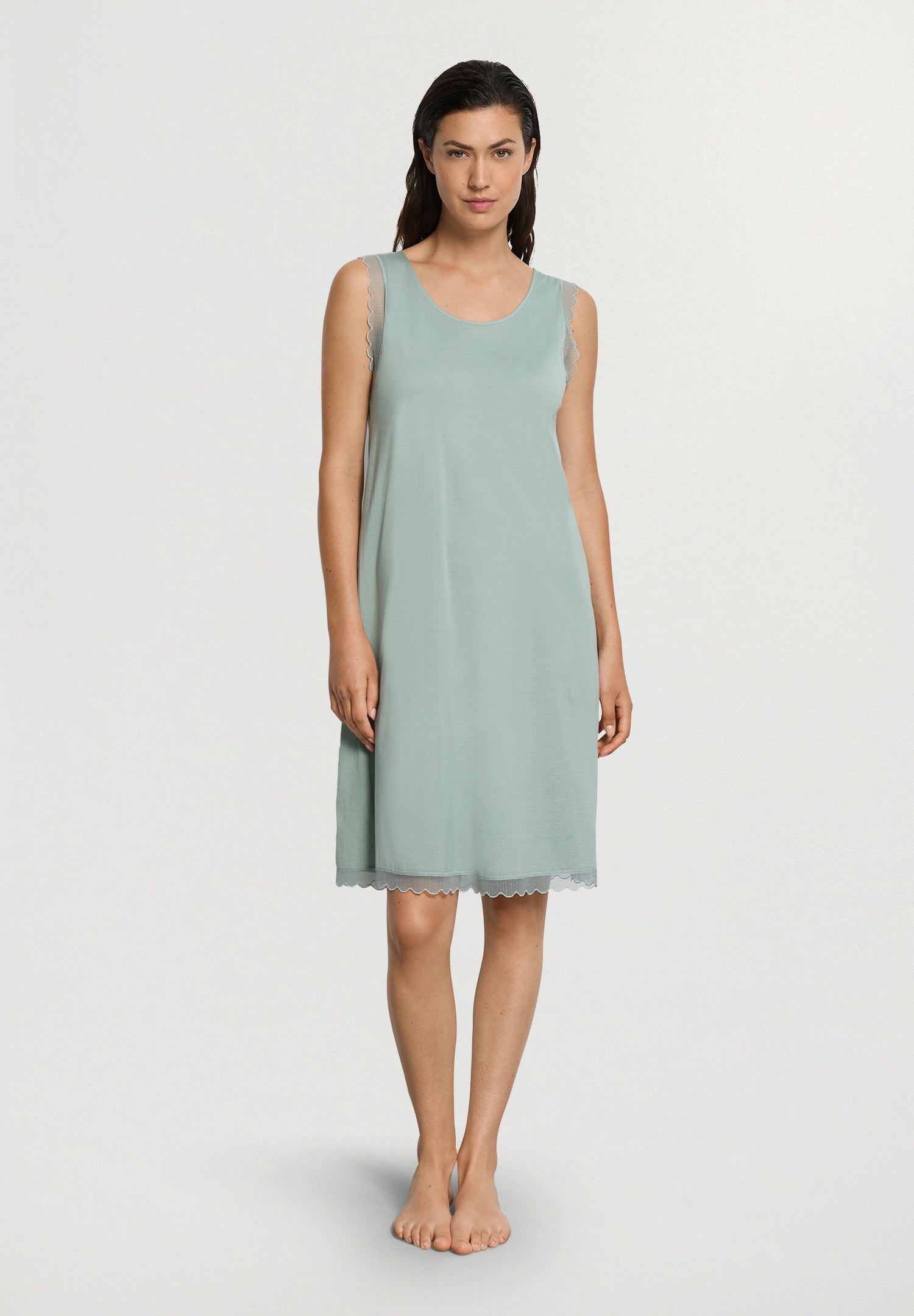Restful nights are the order of the day: this short, sleeveless nightgown made of 100% of the finest US Pima cotton ensures a pleasantly lightweight feel while you sleep. The breathable MADE IN AUSTRIA fabric is perfect for warmer weather. Thanks to the mercerization of the super-combed cotton fibers, the flowing fabric has a subtle sheen and an extra-soft feel. This understated V-neck tank nightgown features delicate tulle lace along the hem and armholes. The semi-transparent, scalloped trim of this modern sleepwear is made in Italy.