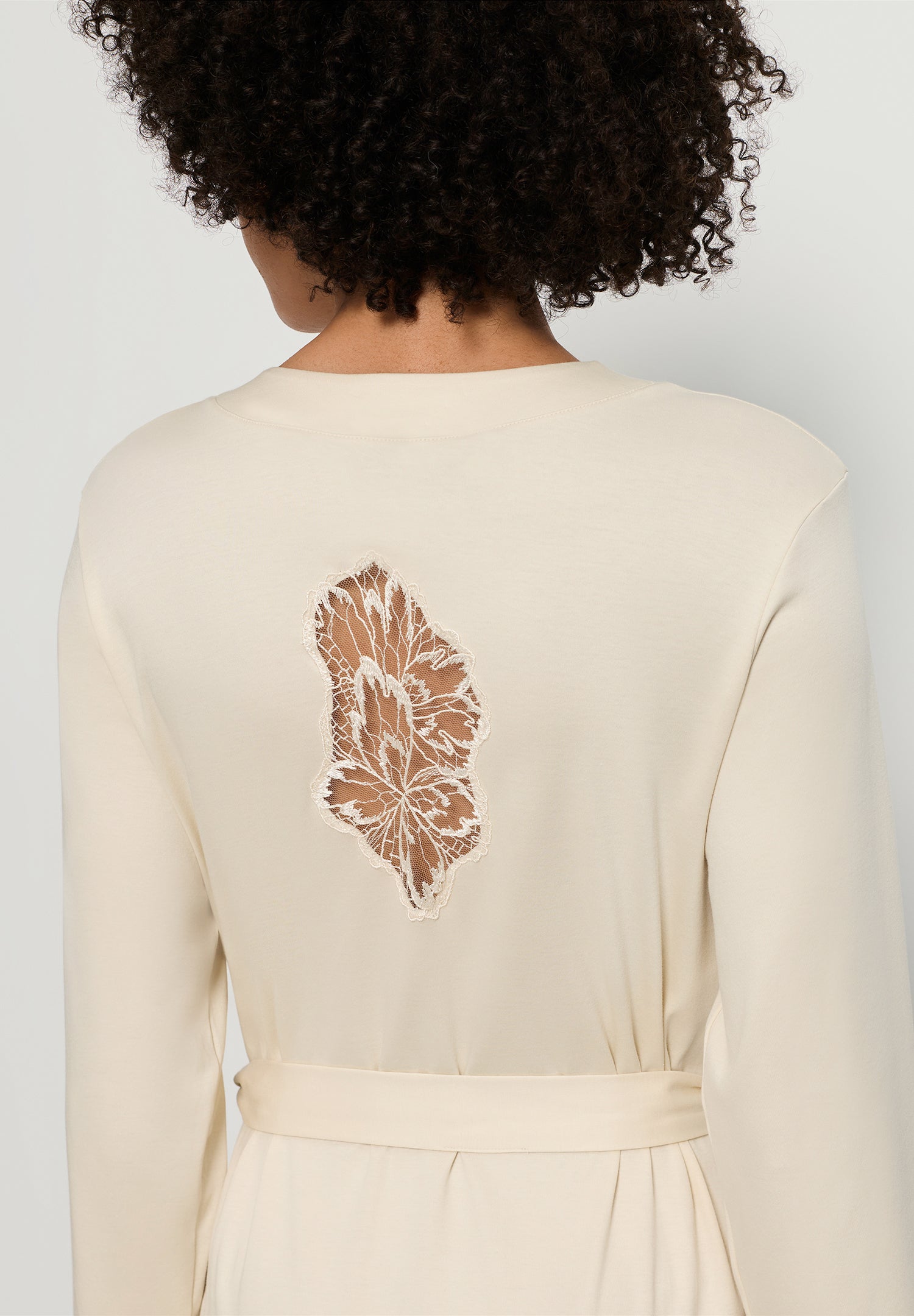A beautiful back can definitely delight such as this flowing, delicately shimmering robe made of 100% mercerized cotton. The slightly translucent, generous floral embroidery on a fine tulle base at the center back is simply enchanting. Embroidery is one of the oldest decorative techniques in the lingerie industry and only a few people have mastered this craft. The floral pattern for this short robe was created exclusively for HANRO by our design team and manufactured in Austria. The supple, easy-care interlock is also made in-house in Austria.