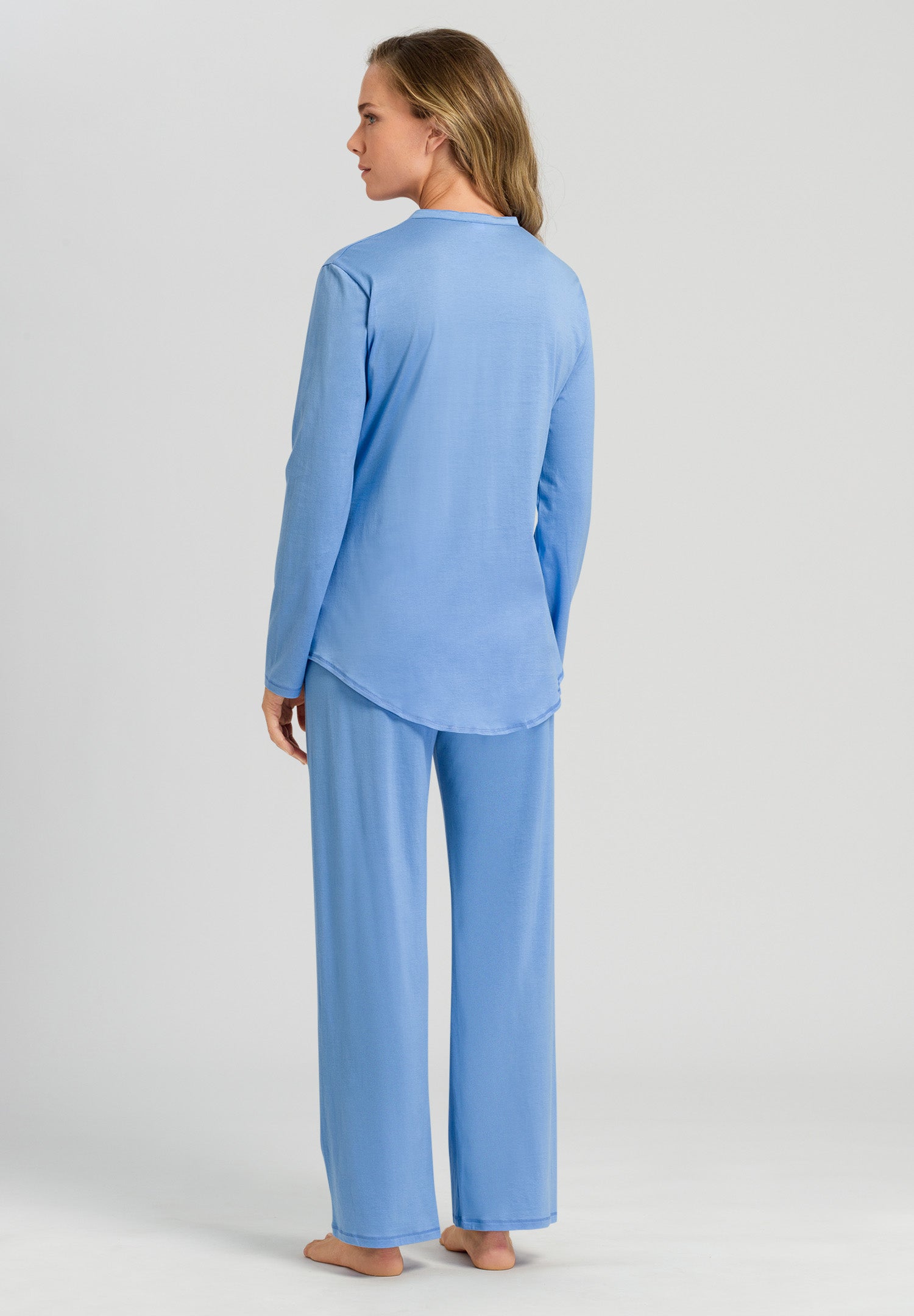 Clean and contemporary, the HANRO Cotton Deluxe Long Sleeve Button Front Pajama set combines classic pajama styling with functional, fashionable design elements. The long sleeve pajama top has a button front with mother-of-pearl buttons and a practical chest pocket, while the full-length pajama pants feature a covered elastic waistband for a custom fit.