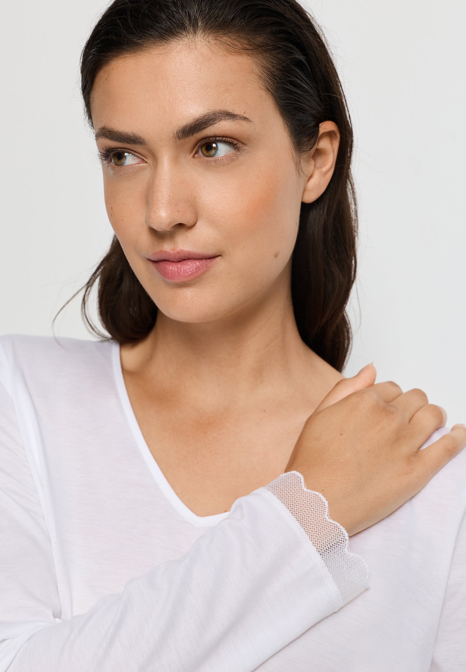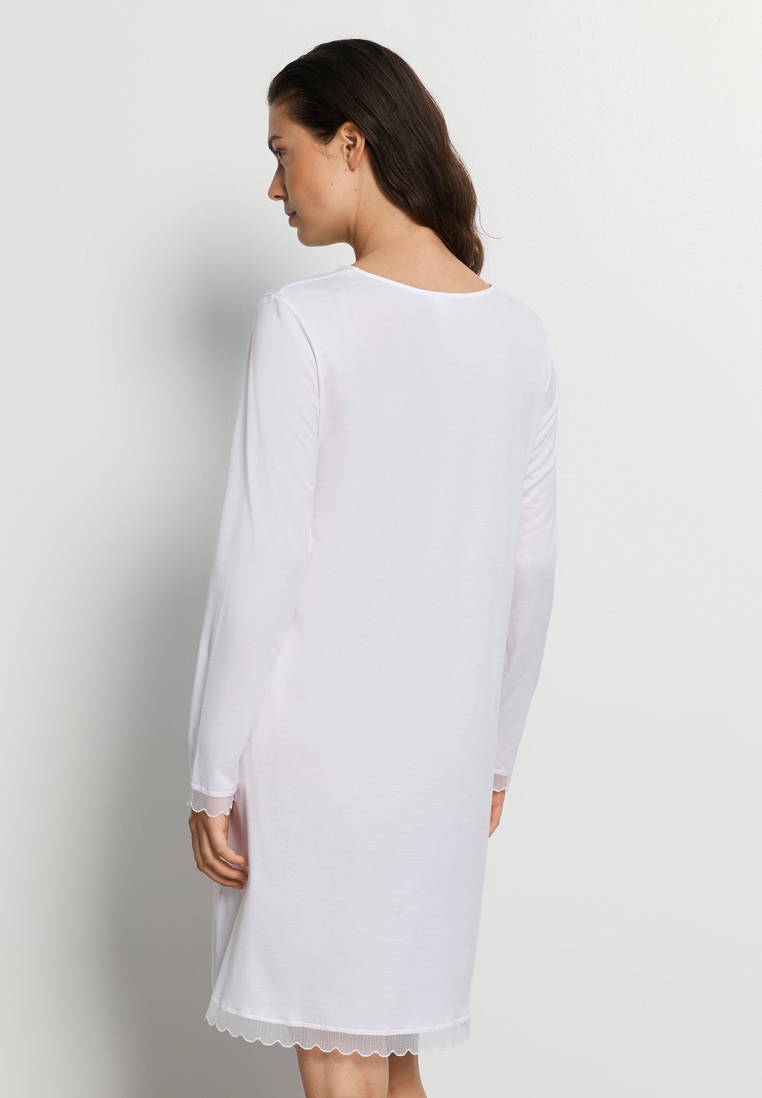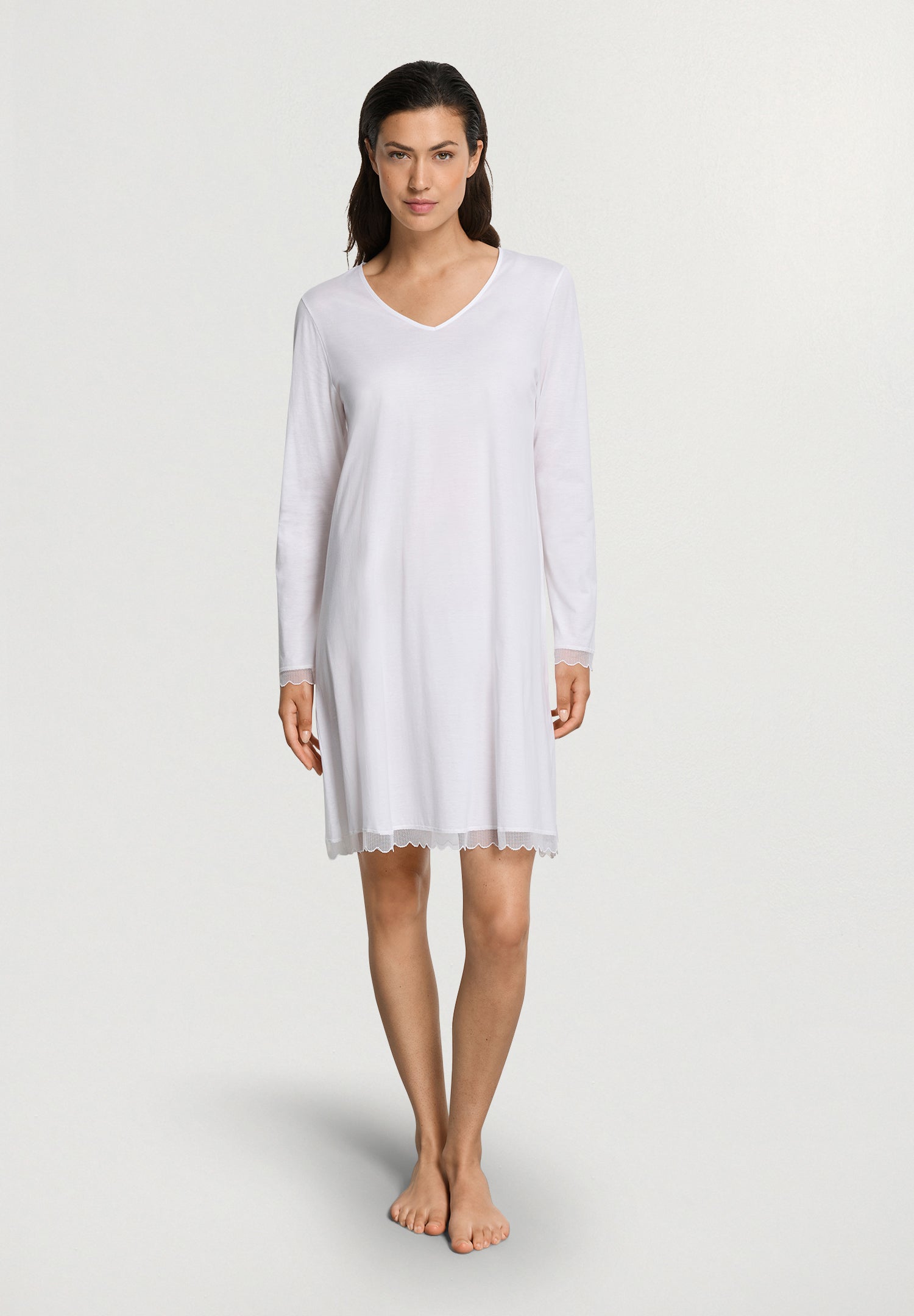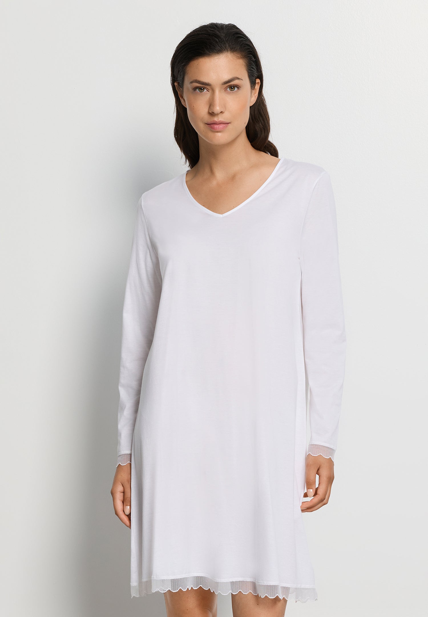 This short V-neck nightgown feels soft and lightweight against the skin. This is due to the special fabric, our bestselling MADE IN AUSTRIA single-jersey. Thanks to the finishing process of the 100% long-staple US Pima cotton , the fabric has a soft sheen, an extra-soft feel and flowing surface. The Italian tulle lace trim in a semi-transparent scalloped look adds a sensual accent to the hem and long sleeves. Lovers of modern feel-good styles rely on the natural breathability and comfortable fit of our first-class cotton sleepwear.