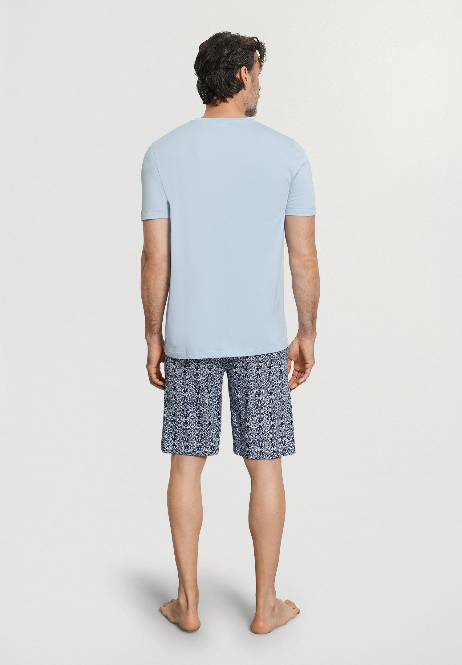 A new era has dawned for pajamas: This pleasantly lightweight, breathable fabric made from sustainable TENCEL™ Modal and natural cotton is perfect for balmy summer nights. The short pajamas made from this flowing single-jersey consist of a solid-colored T-shirt with a masculine V-neck and matching printed shorts. The print on these shorts is inspired by Portuguese azulejos and gives the stylishly understated design a modern twist. The shorts are equipped with a comfortable waistband and two pockets to make them comfortable day or night.