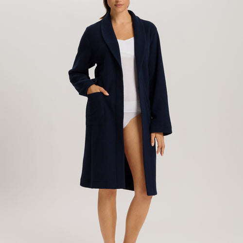 - Practical details include a shawl collar, belt tie and side patch pockets