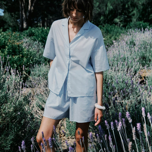 Pajamas at their best with this wide-fit, short-sleeved blouse in a subtle pattern. The airy woven fabric MADE IN AUSTRIA was developed exclusively for HANRO. It is made from 100% superfine cotton and is incomparably lightweight. The modern "boxy" style of the shirt with oversized short sleeves playfully incorporates typical elements from a classic shirt design. This shirt has a full-length button placket and a stylish lapel collar. The matching shorts or pants create stylish ensembles for travel, leisure and sleep.